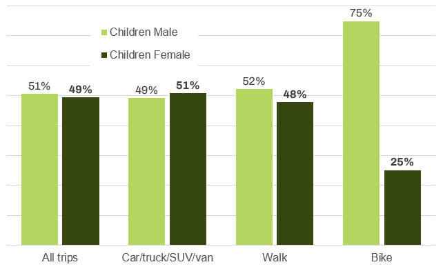 The gap is similar for children. And, there is a small gender gap for walking trips. The difference is not quite as stark when looking at the share of girls v. boys who bicycled in the past 7 days – 29% of girls did so vs. 34% of boys.